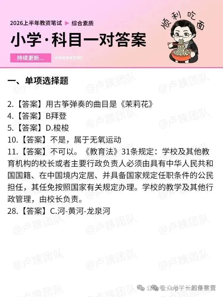 2026上小学《教育教学知识与能力》真题答案与试卷小提醒:卷面分是150分,所以卷面成绩至少90分以上才可以过哟。教资完整答案获取方式: