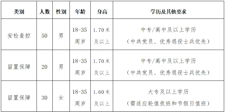 4、安检查控和留置保障岗应具备中专/高中及以上学历,留置保障女性岗位应具备大专及以上学历;
