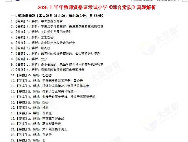 当前位置:首页>笔试真题>【对答案】2026上教资笔试科目一、 二真题(中小幼)及参考答案(20点更新)
