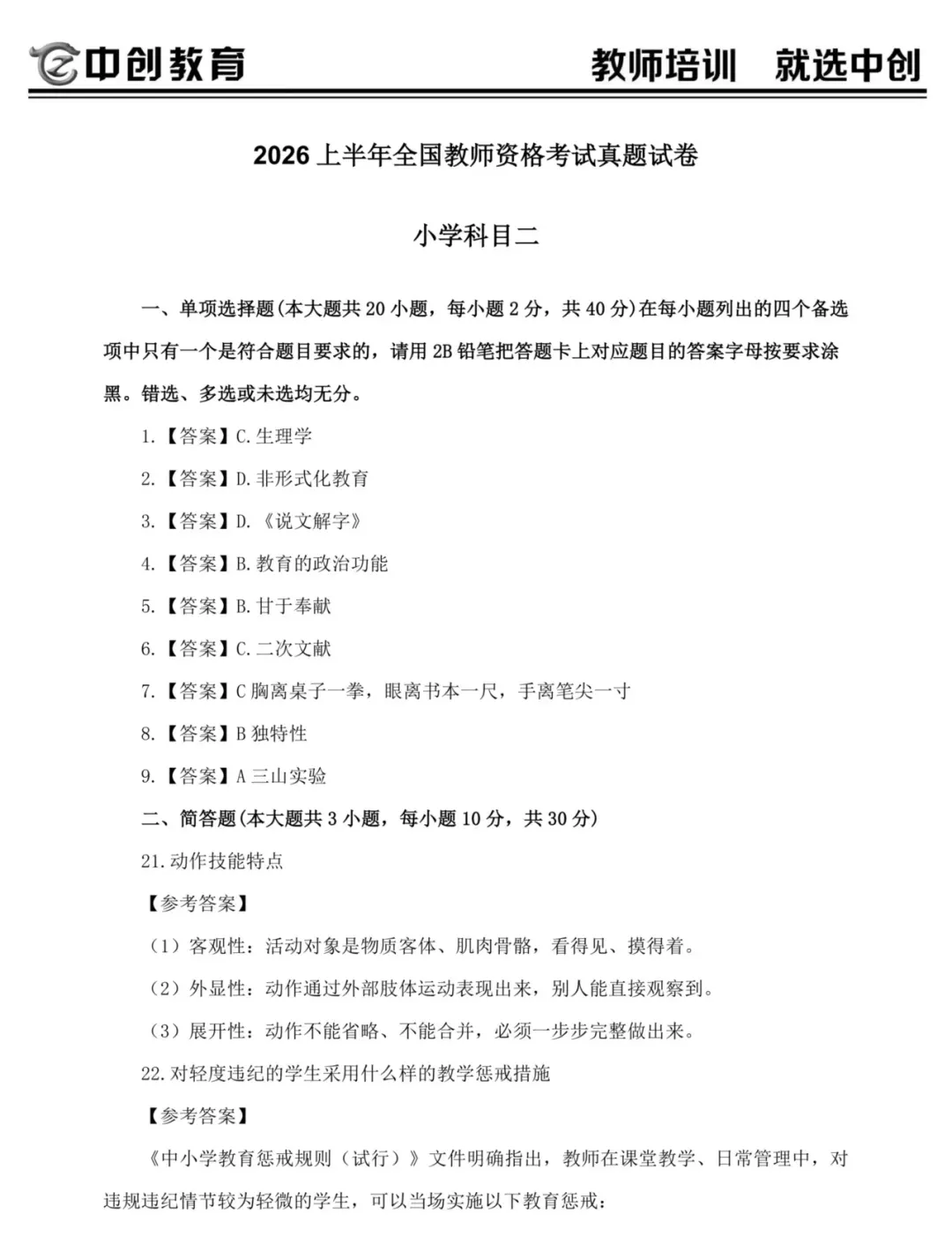 进来估分!26上教资笔试真题答案+详细解析(科一科二科三中学小学幼儿园)!