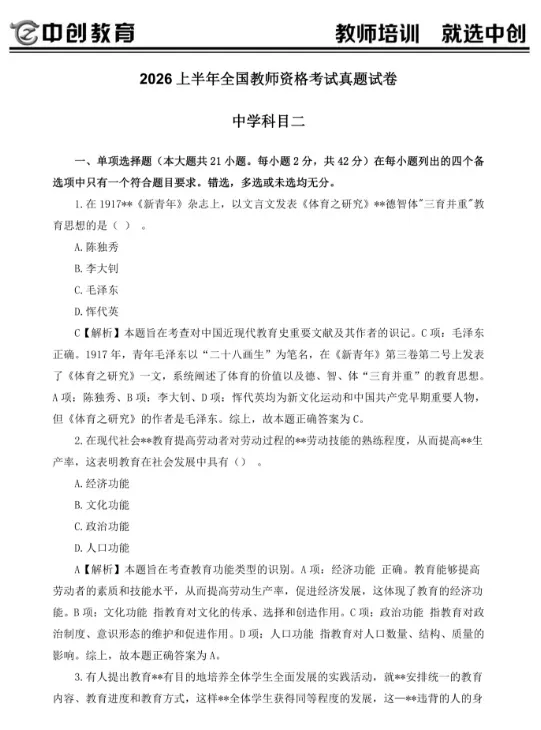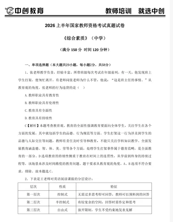 >【教资真题已出,可免费领取!】2026年上半年教师资格证笔试真题已出,附带详细解析,快来领取(考生回忆版)