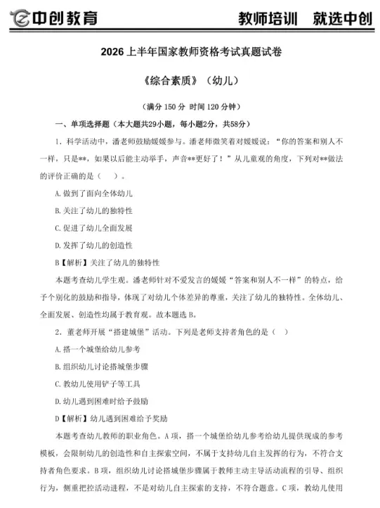 【教资】幼儿园真题答案更新!2026上教资笔试真题试卷及答案解析(选择题+作文,中小幼回忆版)