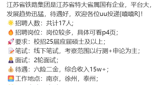 很多粉丝问小编:铁路行业是传统行业,现在入职还有发展空间吗?答案是:不仅有,而且潜力巨大!当前,江苏铁路集团正处于向智慧化、一体化、高质量发展转型的黄金上升期,2026年作为“十五五”开局之年,全省计划开通5条高铁线路,集团迎来项目建设、业务扩张的爆发期,多重红利叠加,成长机遇肉眼可见。1. 国家战略加持,赛道长期确定性拉满