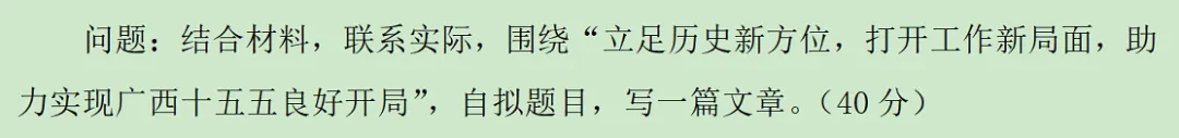 问题:结合材料,联系实际,围绕“立足历史新方位,打开工作新局面,助力实现广西十五五良好开局”,自拟题目,写一篇文章。(40分)