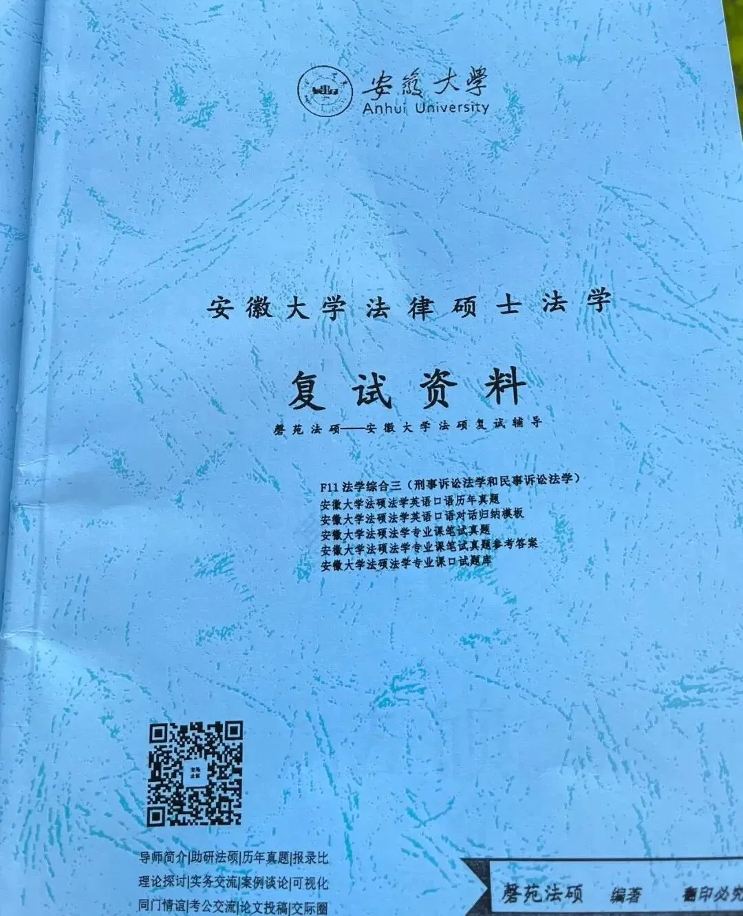 首先把历年真题在马工程教材(安徽大学法学本科教材为马工程系列,研究生无教材)上标注出来,然后以教材为主背诵标记的重点。无论是英语还是专业课,每年重复原题比例还是挺高的,所以题库需要熟背。例如专业课口试真题再审,中级法院管辖的案件多次出现在题库当中。再如英语口语“Oral English: Why did you choose to be admitted to Anhui University for Master of Laws?”多年考察过。