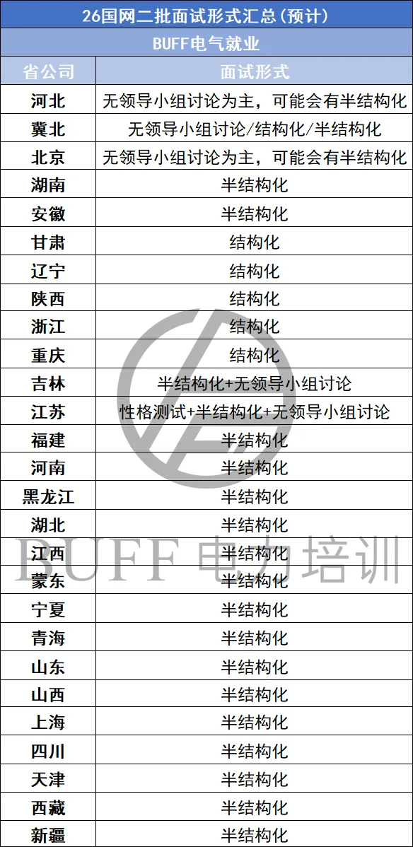 冀北电网的面试形式并不固定,主要在无领导小组讨论和结构化/半结构化面试之间切换,所以最好两种形式都做好准备。无领导小组一般是材料阅读+自我论述+自由讨论+问题总结,时长为45分钟左右,考察思维分析能力、合作能力、创新能力,评委按照综合表现打分;半结构化面试先做自我介绍,然后进行提问,主要是一些意愿和性格能力测试,专业问题不多。由于之前冀北电网面试也出现过无领导小组面试和半结构化面试的混合形式,所以建议大家都认真准备,以便适应后续的两种形式。