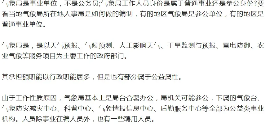 气象事业是经济建设、国防建设、社会发展和人民生活的基础性公益事业。气象局虽然是事业单位,但管理完全参照《公务员法》,待遇和发展都和公务员基本一致,一直是很多考生心中的梦中情岗。那么在气象局工作有多香呢?