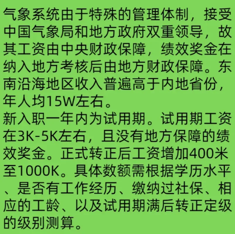 气象系统由于其特殊的管理体制,接受中国气象局和地方政府双重领导,故其工资由中央财政保障,绩效奖金在纳入地方考核后由地方财政保障。部分地方财政吃紧的省份不保障奖金部分,东南沿海地区收入普遍高于内地省份,年人均15万左右。基本养老保险、基本医疗保险、失业保险、工伤保险、生育保险,住房公积金健康体检、机关食堂、提供单身宿舍、通信/交通/劳保/取暖补贴、防暑降温费、工会福利。