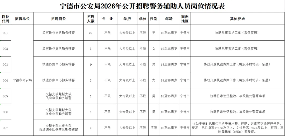 2.从宁德市公安局往期公开招聘的辅警岗位辞职者不得报考。