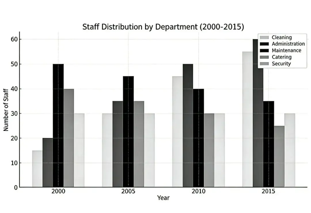 The bar chart shows the number of non-medical staff in a particular clinicbetween 2000 and 2015.Summarise the information by selecting and reportingmain features, and make comparisons where relevant