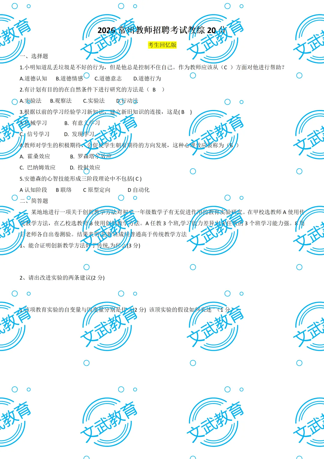 2026常州教师招聘考试真题答案