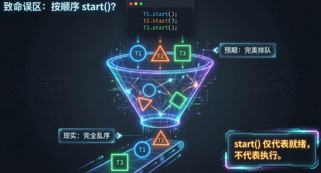 很多同学踩的第一个坑,就是觉得「我按 T1.start ()、T2.start ()、T3.start () 的顺序写,线程就会按这个顺序执行」,大错特错。