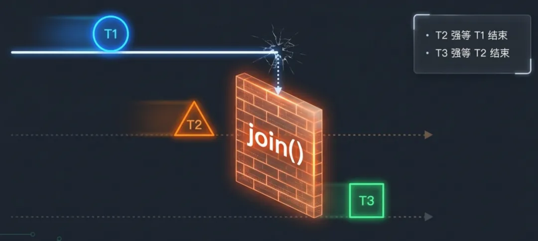 - 在 T3 的业务逻辑开头,调用 T2.join (),强制 T3 等待 T2 执行完再运行