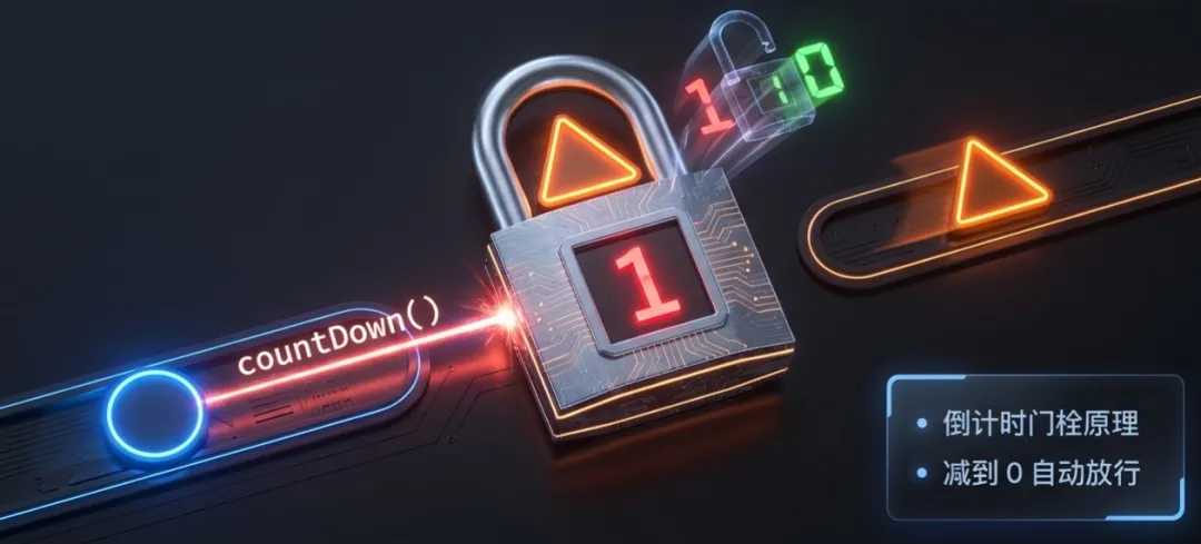 CountDownLatch 可以理解成一个「倒计时门栓」,核心逻辑分为两步: