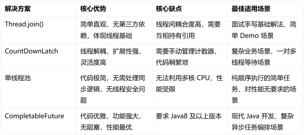 面试的时候,建议大家先讲基础的 join () 方法,再讲 CountDownLatch,然后补充单线程池和 CompletableFuture,再把各个方案的优缺点和适用场景说清楚,面试官绝对会对你刮目相看。