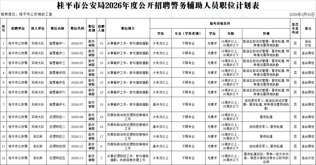 1.桂平市公安局2026年度面向社会招聘警务辅助人员职位计划表(点击图片查看大图)