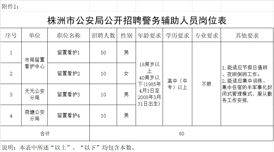 共计划招聘警务辅助人员80名。报考人员可通过株洲市公安局门户网站(http://gaj.zhuzhou.gov.cn/)、 “株洲警事”微信公众号查阅具体招聘岗位、人数和报考资格条件(详见附件1)。