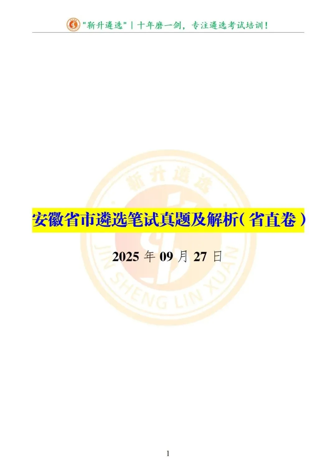 真题分享|2025年09月27日|安徽|笔试|安徽省市遴选笔试真题及解析(省直卷)