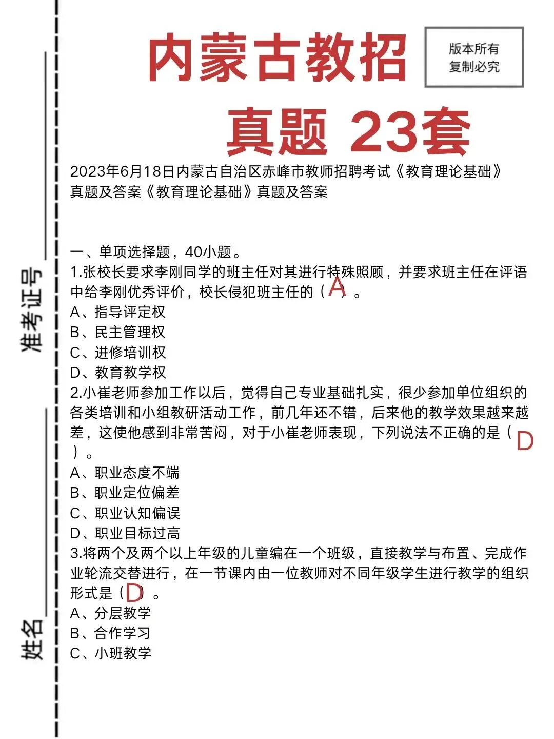 1.【答案】A。解析:A项,指导评定权:这通常是指教师有指导学生的学习和发展,并对学生学业成绩进行公正评定的权利。在题目中,校长强制要求班主任给予李刚优秀评价,显然侵犯了班主任公正、独立地对学生进行评价的权利,即指导评定权。