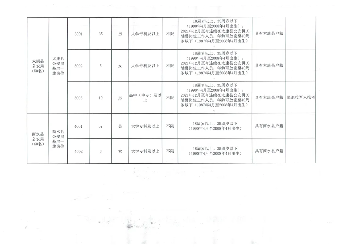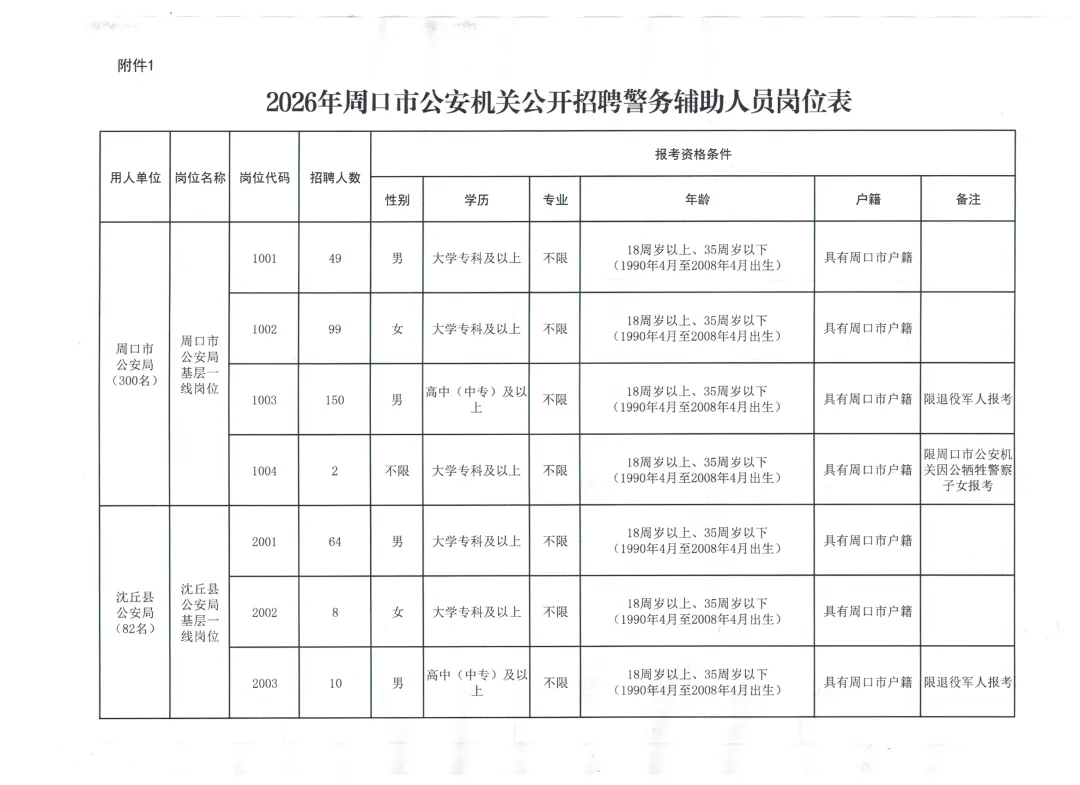 根据工作需要,周口市公安机关面向社会公开招聘警务辅助人员492名(以下简称辅警),其中男性376名、女性116名,具体招聘岗位要求,详见附件1《2026年周口市公安机关公开招聘警务辅助人员岗位表》(以下简称《岗位表》)。现将有关事项公告如下:一、招聘原则按照“公开、平等、竞争、择优”原则和德才兼备的标准,采取考试与考察相结合的方法,择优聘用。二、应聘条件(一)报考者应当具备以下条件:1.具有中华人民共和国国籍。2.拥护中华人民共和国宪法,遵守国家法律、法规和社会公德。 3.自愿从事警务辅助工作,具有忠诚奉献、吃苦耐劳精神,服从组织分配。4.具有周口市户籍(含所辖县、市、区),对户籍有特殊要求的,以《岗位表》为准。5.年龄在18周岁以上、35周岁以下(1990年4月至2008年4月出生),对年龄有特殊要求的,以《岗位表》为准。6.具有国家承认的大学专科及以上学历,退役军人可放宽至高中(中专)学历。报考者应当在报名前具备相应资格条件。7.具备履行岗位职责所需要的身体素质、心理素质和工作能力。8.具备招聘岗位所要求的其他资格条件。(二)具有下列情形之一的,不得报考:1.曾被开除中国共产党党籍、开除中国共产主义青年团团籍、在高等教育期间被开除学籍、被机关事业单位开除公职或辞退的。2.编造、散布有损国家声誉、反对党的理论和路线方针政策、违反国家法律法规信息的。3.在军队服役期间受记大过以上处分或者受党内严重警告以上处分的。4.受过刑事处罚或者涉嫌违法犯罪尚未查清的。5.曾被行政拘留、司法拘留、劳动教养、收容教育、收容教养或因吸毒、嫖娼、赌博受到处罚的。6.在各级公务员招考等国家法定考试中被认定有舞弊等严重违反录用纪律行为的。7.有较为严重的个人不良信用记录的。8.曾因违反公安机关警务辅助人员管理规定,被解除劳动合同的。9.本人家庭成员被判处死刑、正在服刑或正在接受调查的。10.本人或家庭成员参加非法组织、邪教组织或从事其他危害国家安全活动的。11.现役军人、在读的全日制普通高等学校学生。12.其他不适合从事警务辅助工作的情形。(三)同等条件下优先聘用以下人员:1.烈士遗属、因公牺牲军人和警察遗属。2.退役军人、退出国家综合性消防救援队伍的救援人员。3.见义勇为英雄、模范和先进个人及其配偶和子女。4.警察类或者政法类院校毕业生。5.具有岗位所需专业资质和专门技能人员。6.国家和河南省规定的其他优先聘用情形。三、招聘程序(一)网上报名1.提交报名申请。报考者于2026年4月3日9:00至2026年4月7日12:00,登录周口市公安局辅警招聘网上报名系统网站(https://zkgaj.hnrlzyw.com/),按照流程和要求进行考试报名,并上传电子照片(本人近期1寸免冠蓝底背景证件照、JPG/JPEG格式,大小2M以下,必须反映本人真实特征)。每名报考者限报考一个岗位,考试录用全过程使用的本人有效身份证及相关信息应一致。报名前,报考者须认真阅读并签订报考诚信承诺书,报名时如实填写个人信息,因误报、错报岗位或者提交虚假信息等所产生的一切后果,由报考者本人承担。有伪造、变造有关证件、材料、信息等骗取报考资格等行为的,将按有关规定严肃处理。2.报名资格审查。报名期间将对报考者提交的信息进行资格初审,资格初审由报名系统自动即时审核,并及时在网上反馈初审结果。报考者提交信息后,可随时登录原报名网站,查询报名资格初审结果。报名申请提交成功的,即为通过资格初审,报考者不能再改报其他岗位,也不能再修改报考信息;未通过资格初审的报考者,可于2026年4月7日17:00前如实修改完善相关信息并重新提交报名申请,也可改报其他资格条件相符的岗位。2026年4月7日17:00报名系统关闭后,不能再提交报名申请或者改报其他岗位。资格初审不对报考者填报信息的真实性、准确性进行审核,初审通过不代表报考者符合报考岗位资格条件。3.网上缴费。通过资格审查的考生,需及时登录报名系统缴纳笔试考务费(每人30元),缴费截止时间为2026年4月7日18:00,逾期未缴费的,按自动放弃处理。因考生个人原因不能参加笔试或放弃参加笔试的,笔试考务费不予退回。各岗位的报名人数与拟招聘人数的比例应当不低于3:1,达不到以上规定比例要求的,相应核减该岗位的拟招聘人数直至取消该岗位(因公牺牲警察子女岗位招聘各环节不受最低比例限制),核减、取消岗位的拟招聘人数,可调剂到同一招聘单位的其他岗位。周口市公安局根据各招聘岗位符合资格条件的报名人数,对核减、取消岗位的拟招聘人数进行调剂,核减、取消招聘的岗位和调剂情况,统一在周口市公安局官方网站(http://gaj.zhoukou.gov.cn/)公布。报考岗位被取消的考生,可在规定时间内重新选报其他岗位,未重新选报的,视为自动放弃报名资格,退还缴纳的笔试考务费。4.打印笔试准考证。已确认缴费成功的人员,请根据周口市公安局官方网站发布的通知,登录周口市公安局辅警招聘网上报名系统网站自行下载打印笔试准考证(A4纸格式,考生可打印多份备用)。(二)笔试1.笔试内容包含公共基础知识和专业基础知识,满分为100分。笔试时间和地点另行通知,详见笔试准考证。2.考生须持本人有效身份证件和笔试准考证参加笔试,证件不齐者,不得参加考试。笔试结束后需妥善保管笔试准考证,笔试准考证作为考生参加