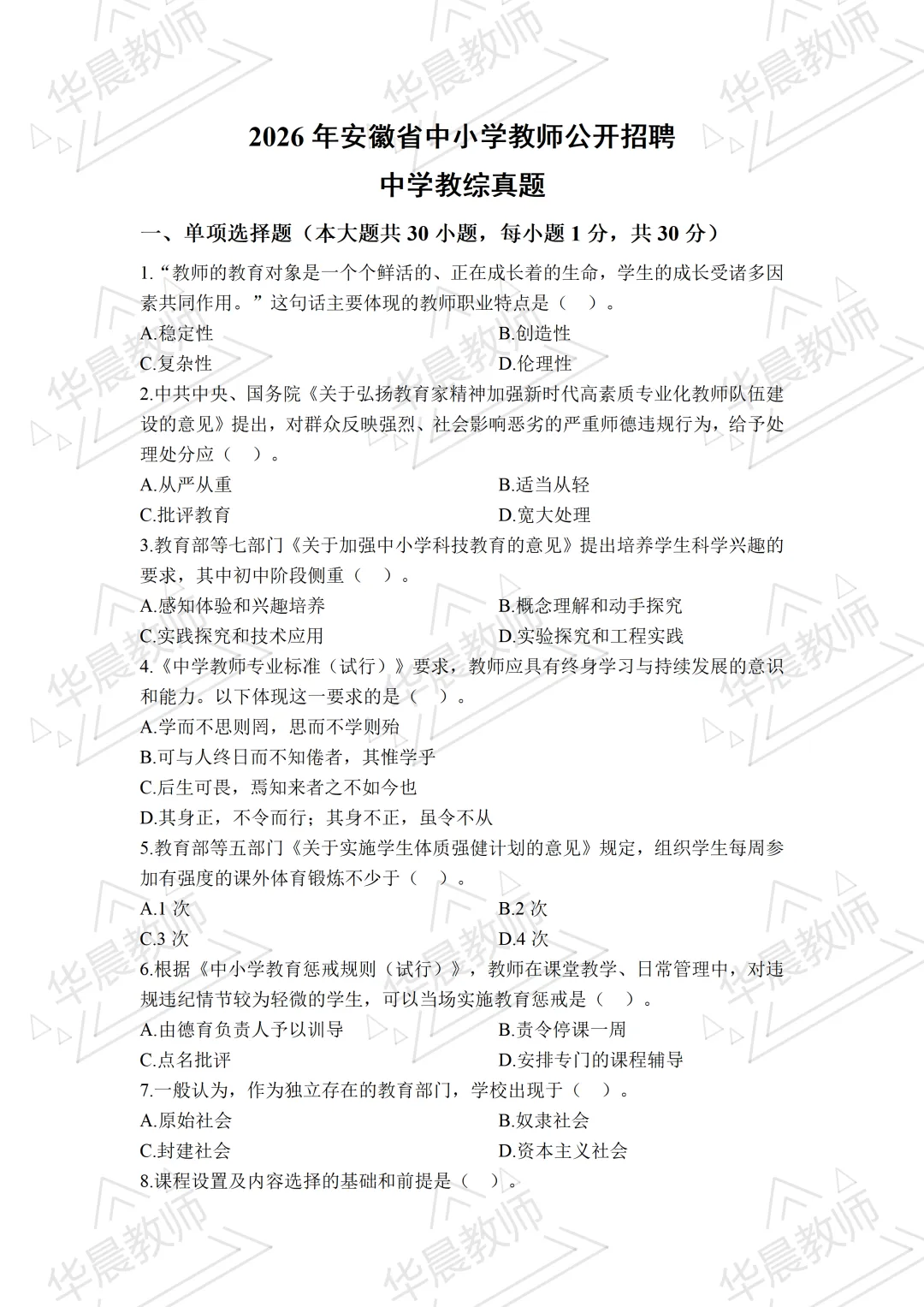 安徽教师招聘||26安徽统考中学教综笔试真题答案!