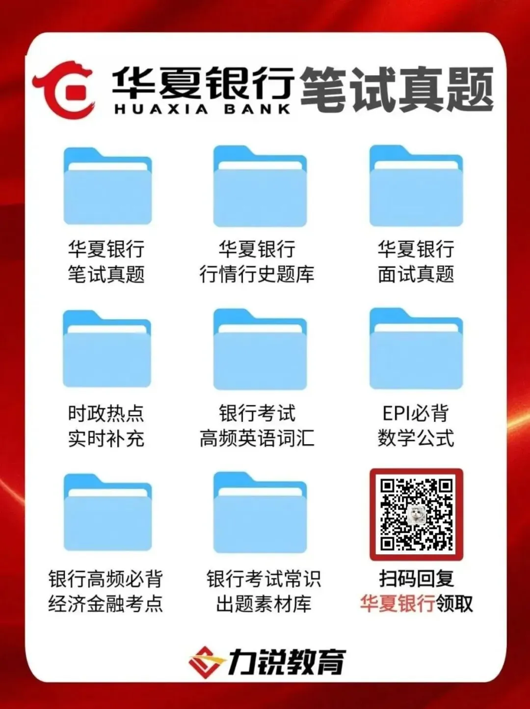 各位报考华夏银行2026春季校园招聘的考生请注意!华夏银行2026春招笔试通知已正式下发,笔试将于4月11日(本周六)10:00-12:00正式开考!在这里,力锐教育为大家准备了华夏银行笔试真题,添加力锐教育贺老师微信zkpt119免费领取,或者扫码领取!
