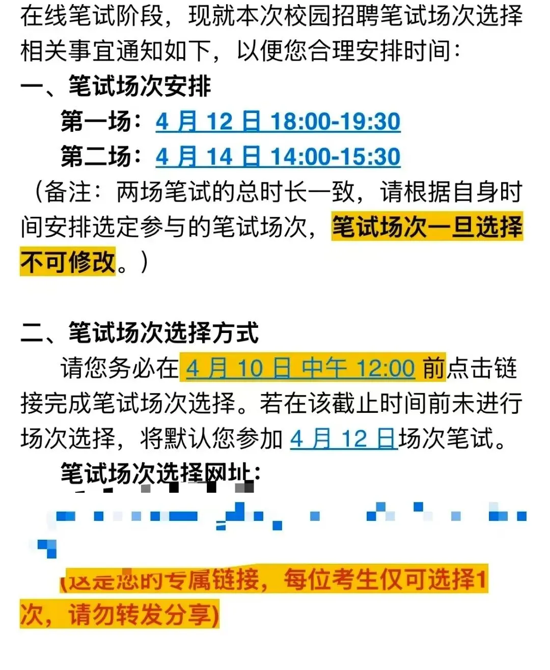 请您务必在4 月 10 日 中午 12:00 前点击链接完成笔试场次选择。若在该截止时间前未进行场次选择,将默认您参加 4月12日场次笔试。